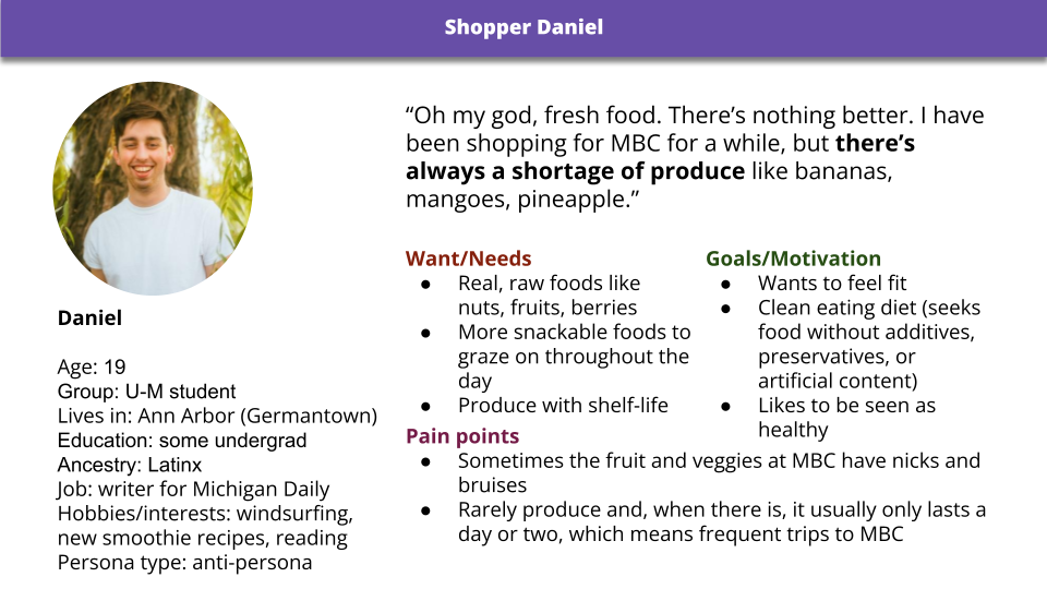 “Phil's solution has a future beyond this course. It offers an opportunity for the MBC (and other non-profit organizations centered around food accessibility) to provide equitable access to food more effectively.”