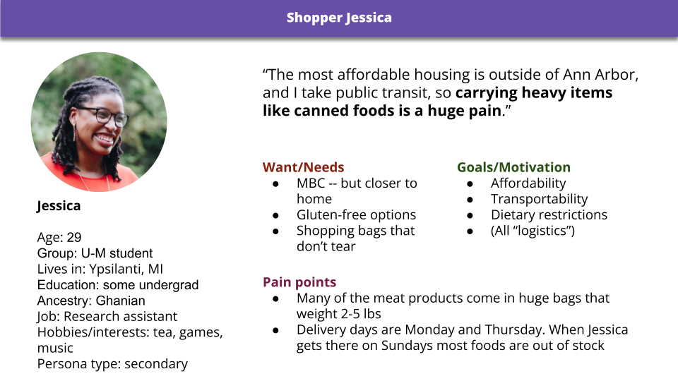 This was an insightful part of the project. I conducted five semi-structured interviews: with two MBC shoppers, one non-MBC shopper, one MBC worker, and one non-MBC worker. (I see value in interacting with fringe and adjacent users.)