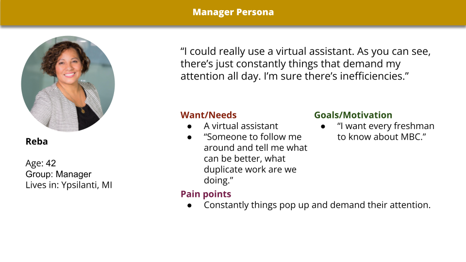 It wasn’t until later I realized I would want to include volunteers and managers. They were crucial to my product, though I wouldn’t know it for several weeks. So, I created the personas for Joel and Reba.